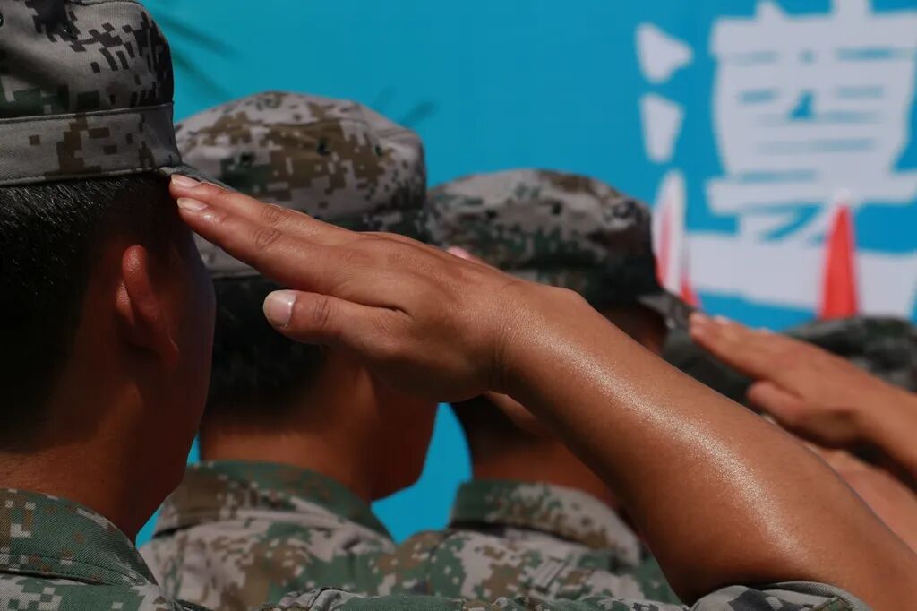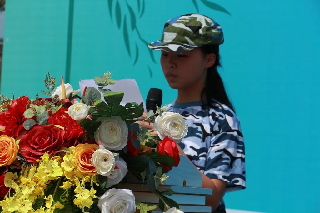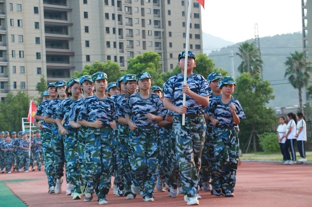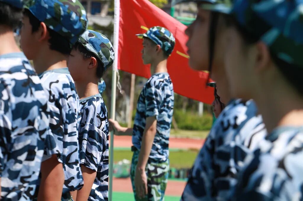 金色的阳光下与军绿色相映衬,印在青春的手册上,熠熠生辉。随着国歌的雄壮乐声,开营仪式正式开始。教官们举着五星红旗正步行进,较之平日的升旗仪式,更增添了庄严肃穆的感觉。全体人员肃立,面向国旗行注目礼,鲜艳的国旗在炎炎烈日下迎风飘扬。在庄严的国旗下,七(11)班的胡聿娴同学代表七年级全体新生发言,表明会在这三天的行规教育中经受考验,磨砺自身,成为更优秀的自己。